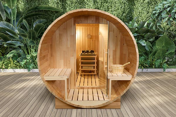 Eine Sauna ist eine Kabine, die trockene Hitze erzeugt und mit Sitz- und Liegebänken ausgestattet ist.